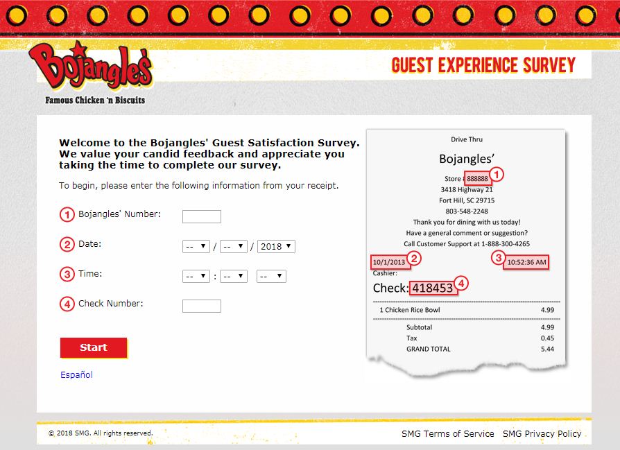 ✅ Per visit receipt only one Bojangles Listens Survey Entry is available.