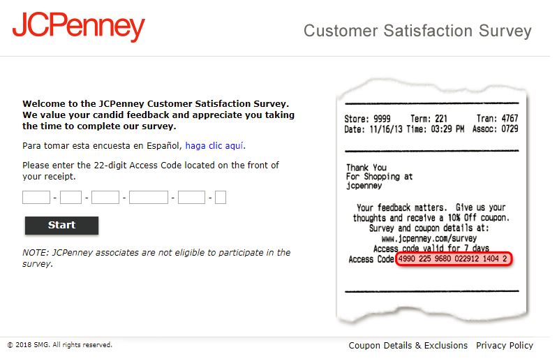 - Enter the 22 digits access code from your last purchase receipt of the JCPenney Store. And Press the “START” Button.