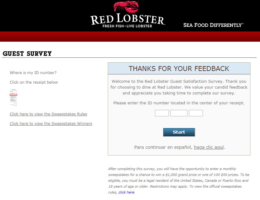 ◀ Red Lobster Customer Experience Survey offers their Survey takers an entry in Sweepstakes of worth $1000 for the grand prize winner and $50 for another hundred winners.
